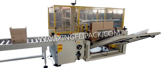 本機將疊成紙板的箱子自動打開,箱子底部按一定程序折合,并用膠帶密封,可單獨使用,也可與裝箱機連線使用。廣泛應用于食品,化工,日用品等行業。